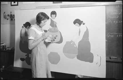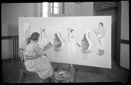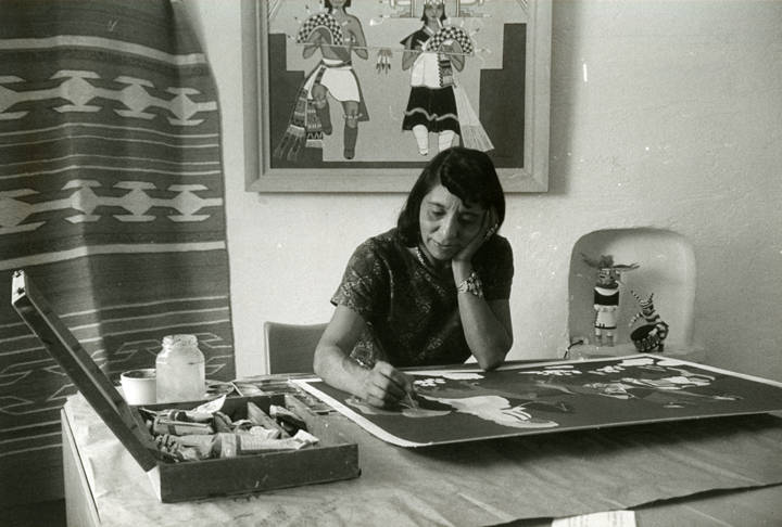 Prior to the move, Peña was introduced to Western-style art by her San Ildefonso Day School teacher, Esther B. Hoyt, who prompted her, along with other students, to paint what they saw in their community, including traditional dances. Hoyt bought some of Peña’s first watercolor paintings. Several other talented “self-taught” painters from San Ildefonso also emerged with Hoyt’s support, but Peña was the only woman; this group of painters established a new painting tradition, which, in turn, led to the creation of the SFIS studio. While in San Ildefonso, Peña met Edgar L. Hewett, an archaeologist and anthropologist who founded the School of American Research in Santa Fe; he encouraged her to paint and supplied her with watercolor paints and paper.